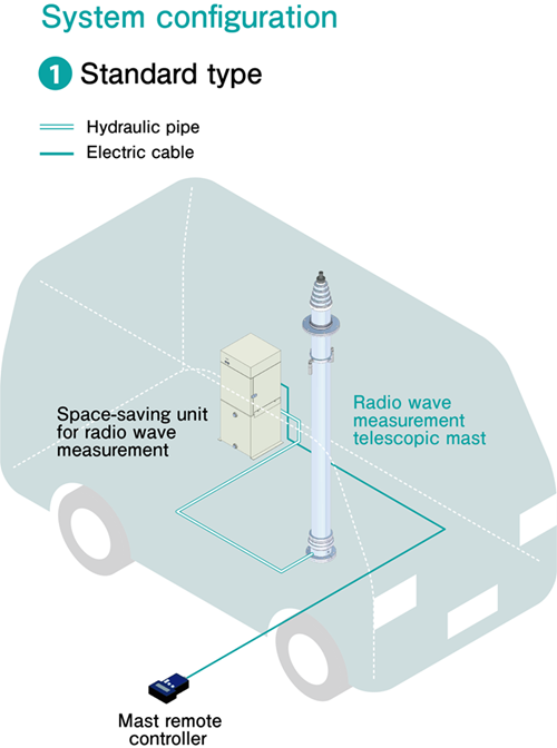 Mast extension and contraction are controlled via a hydraulic power unit, achieving quiet operation that makes the mast usable even at night.