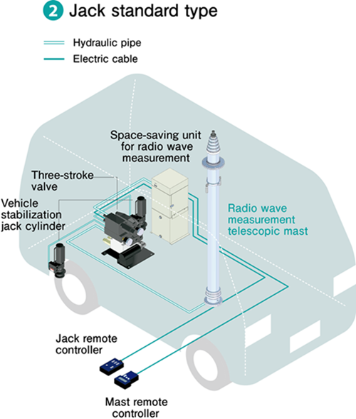Remote controller for jack operation. In addition to ON/OFF control, the remote controller enables you to extend and contract left or right individually or extend and contract the entire unit. When using four cylinders, you can switch between front and rear jacks.