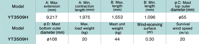 A maximum height of 9.2m(10m when mounted on vehicle) with a product weight of only 44 kg.