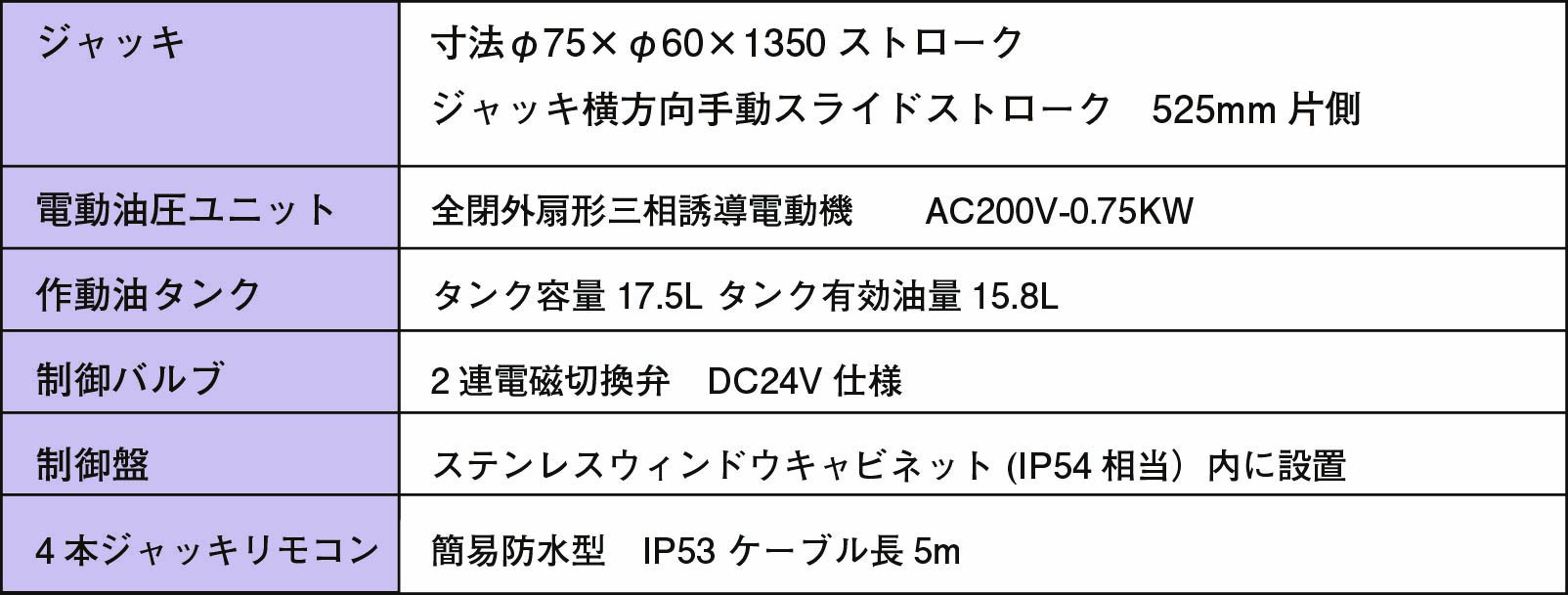 リフター用ジャッキシリンダを伸縮させるタンク一体型油圧ユニット。2本のジャッキシリンダを1ユニットで動作させます。ジャッキリフター1台につき2ユニットの構成です。
