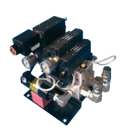 車体安定ジャッキシリンダを駆動させる3連バルブ。4本用は5連バルブとなります。