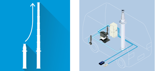 ユアサ工機の伸縮ポールシステムは、放送、通信、交通、消防、警察など公共性の高い分野で、災害基地局車や中継車などに使用されております。ユアサ工機の油圧式伸縮ポールシステムは高強度で耐振動性、耐風速性に優れ、高所でも正確な位置制御が可能です。災害、事故、非常時、緊急時、防災、防犯などの危機管理等、失敗の許されない場面において、空中高く取り付けたい機材を確実に迅速に正確な位置へと届けます。