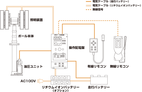 ポールの昇降・旋回俯仰装置の回転、LED照明の点灯/消灯を操作するためのリモコンです。遠隔からケーブルレスで操作可能です。